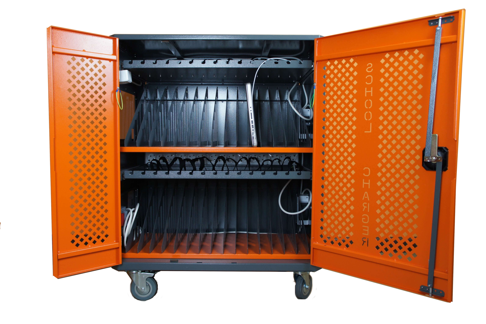 Над каждой полкой расположена выдвижная панель 400 мм с розетками для зарядки ноутбуков, также имеются дополнительные крепления в виде текстильных лент для дополнительной поддержки сетевых шнуров питания, их можно закрепить и вставить в розетку на подзарядку. Поскольку питание происходит от розеток, тележка может зарядить практически любое устройство